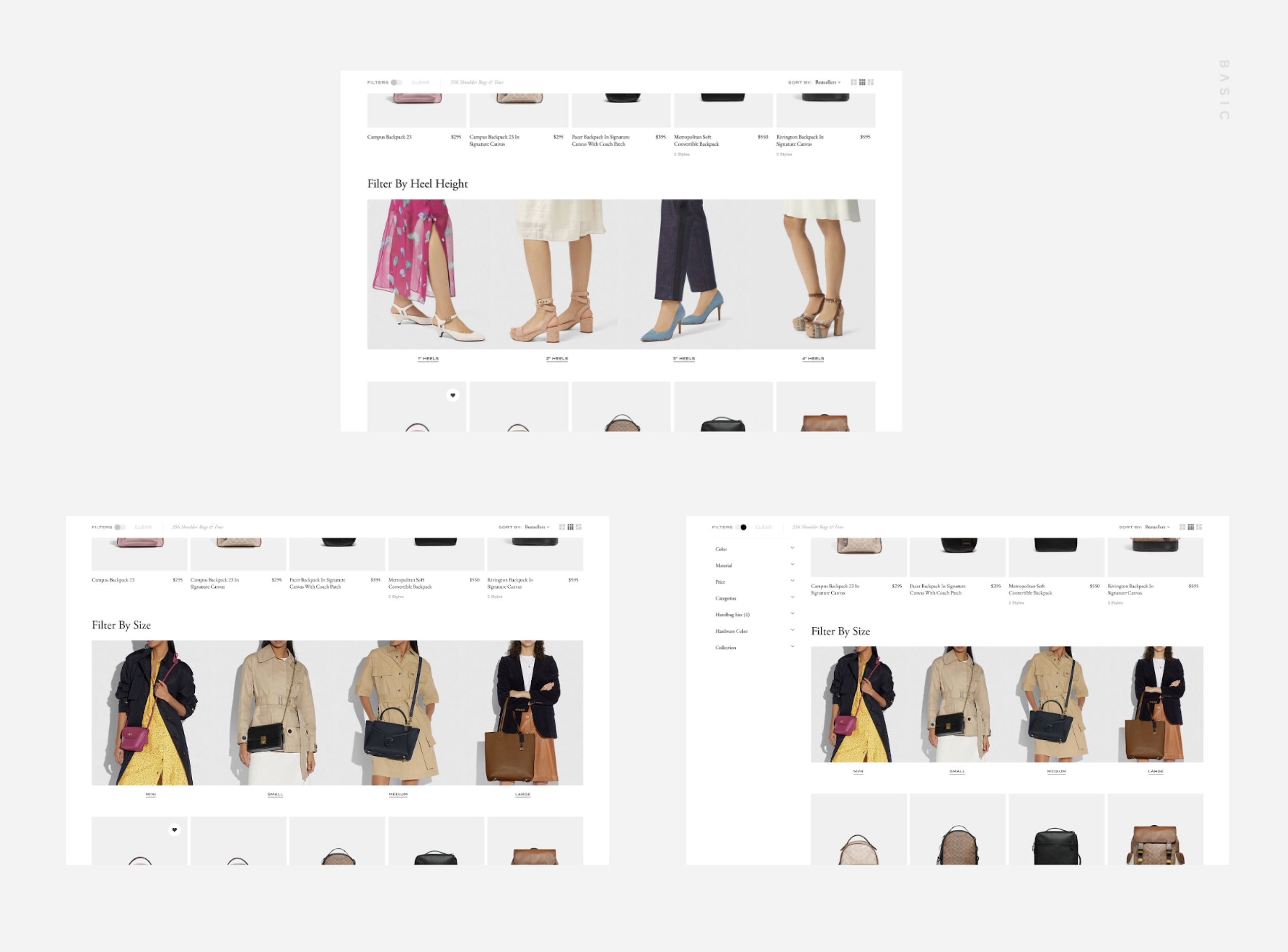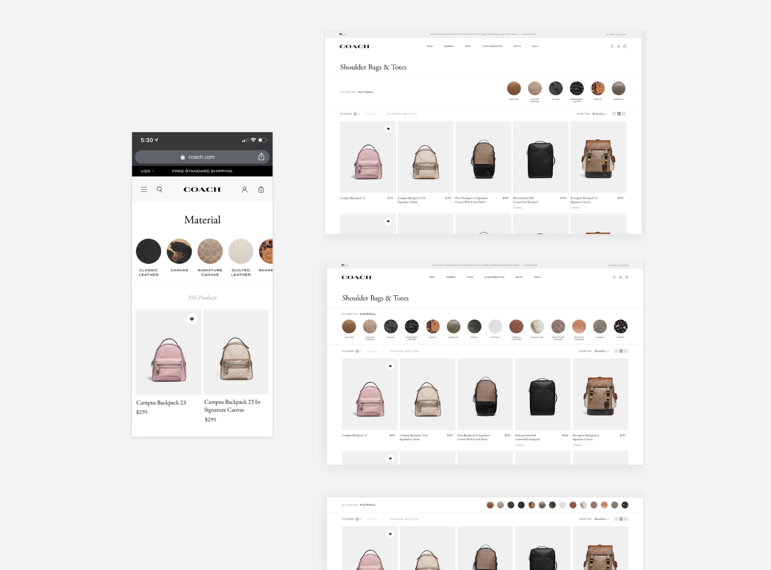 Evolve the 3 Tapestry brands Product Landing Page (PLP) & Product Detail Page (PDP) experiences through the lens of Coach. Dallas was primarily in charge of the PLP system so the following explorations will be focused primarily on PLP.