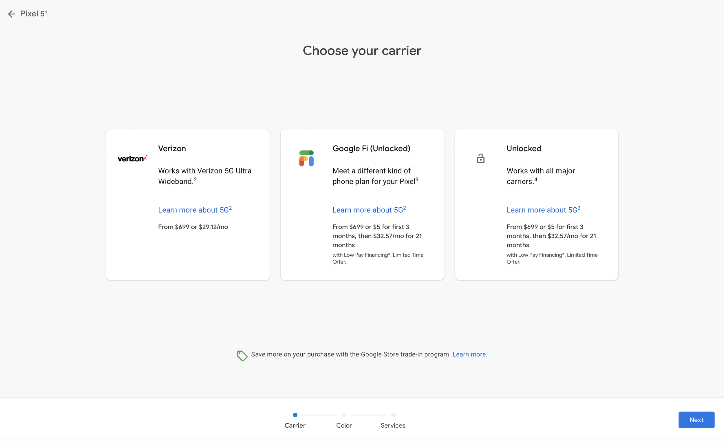 After much user research, the solution with the least amount of pain points was to create a flexible single page configurator for all Google devices. The most complex product configuration condition was that of Pixel phones, so the config system was designed based off of this most complex use case then scaled down to fit more simple products. This system lets users focus on one decision at a time while still maintaining the ability to review past choices, easily edit them, and understand the dependencies of how their current choice may impact future choices. This system also allows users easily be able to dynamically see how their choices at each stage impacts the total product price.